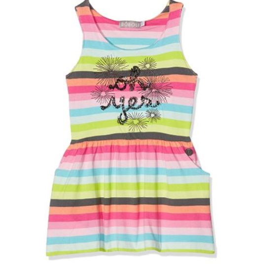 Un vestido de rayas en varios colores, y dibujo en la parte central. Tirantes gruesos y lavable a máquina. Ver en Amazon.