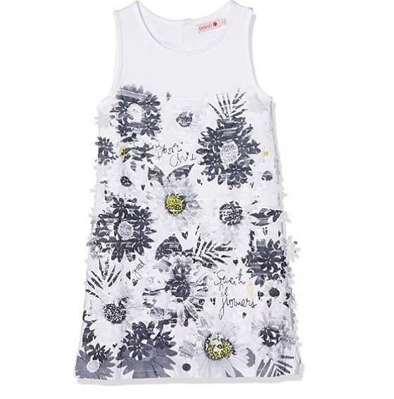 Para las niñas más presumidas este bonito vestido de cuello redondo sin mangas. Fondo blanco y estampado en color azul marino. La parte trasera es blanca y se abrocha en la zona del cuello con dos botones. Está confeccionado con viscosa 4% Elastano Forro:96% Viscosa 4% Elastano. Se la lava a máquina a una temperatura máxima de 30º. Ver precio en Amazon.