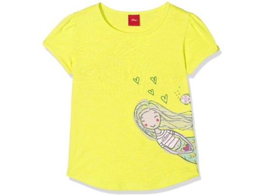 Manga corta y cuello redondo, fondo amarillo y un dibujo de una sirena con su camisa de rayas de S. Oliver. Ver precio en Amazon.