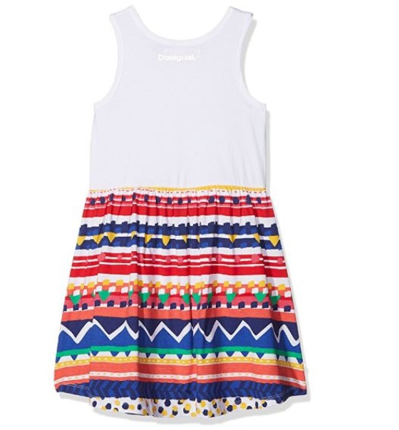 Sin mangas con cuerpo en blanco y estampado de mariposas y flores. La falda muy colorida al estilo de Desigual que alterna otros estampados dentro de las rayas. Un vestido 100% algodón para que las niñas vayan cómodas y frescas. Ver en Amazon.